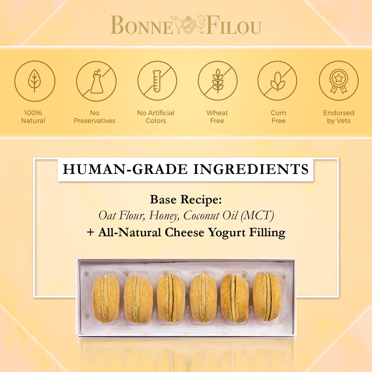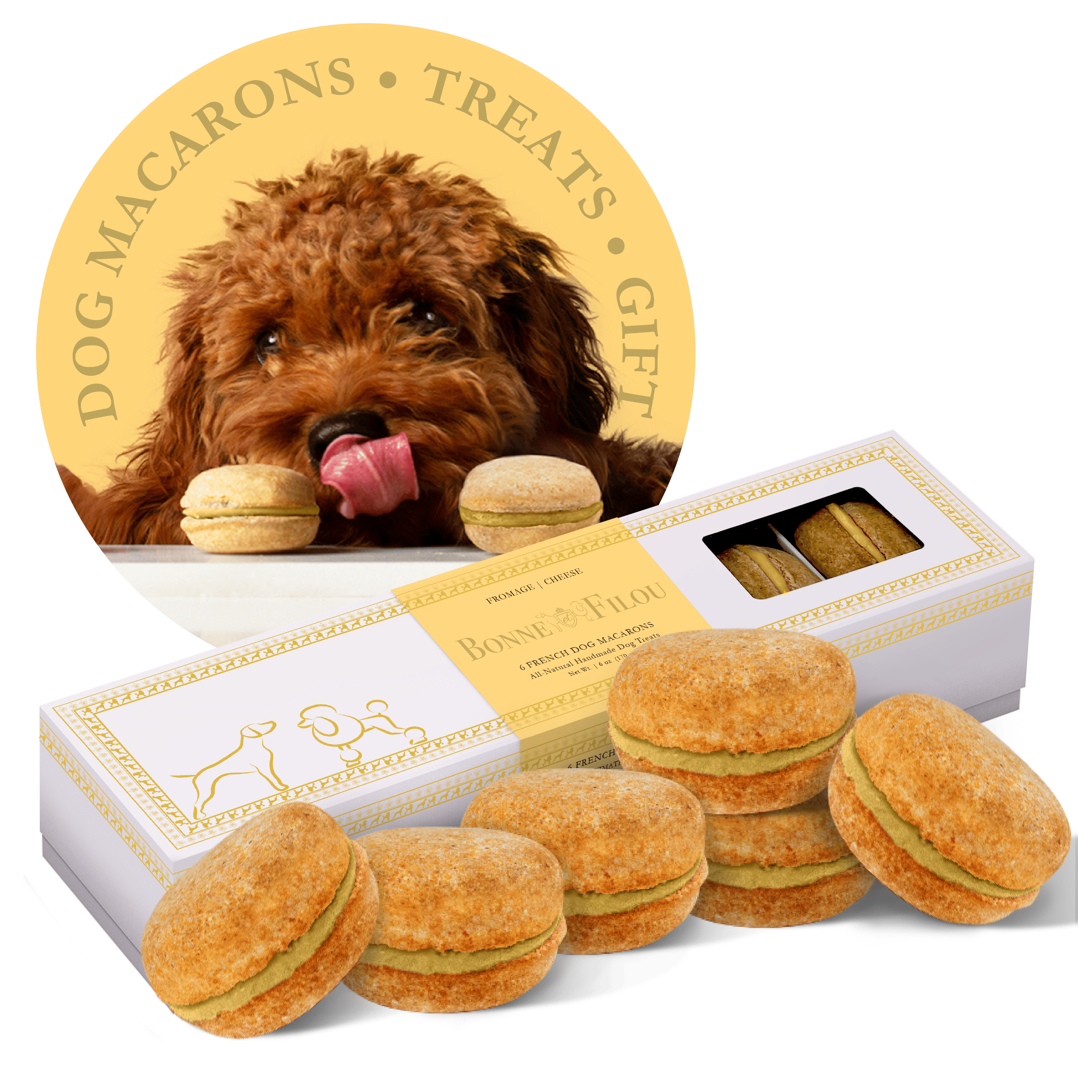 Dog Macarons - Count of 6 (Dog Treats | Dog Gifts)This box of our premium macaron treats features: - Box of 6 dog macarons- Handmade with premium human-grade ingredients in the USA- 100% natural; corn-free; wheat-free ingredients- No artificial coloring or preservatives- Hard treat designed for a long-lasting chew- Shelf life of 18+ months | No need for refrigerationBase Recipe Ingredients: Oat Flour; Honey; Coconut Oil; All-Natural Flavored Yogurt FillingFeeding Instructions:Our treats are hard; designed for a long-lasting chew. For elderly or small dogs; we recommend breaking the treat in smaller pieces (by twisting both sides).