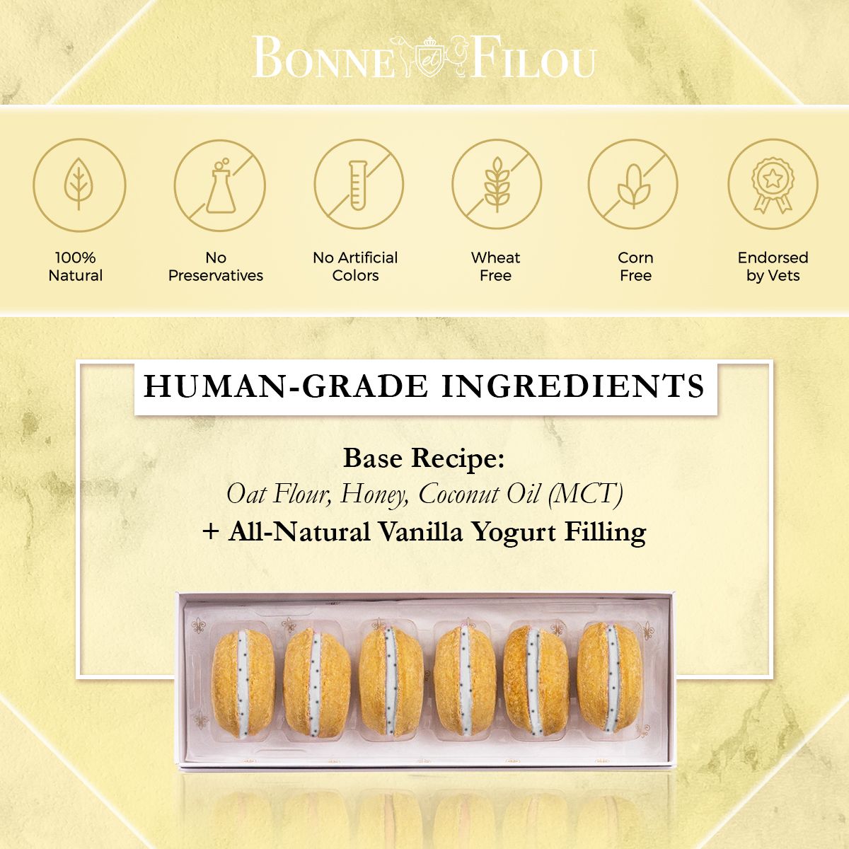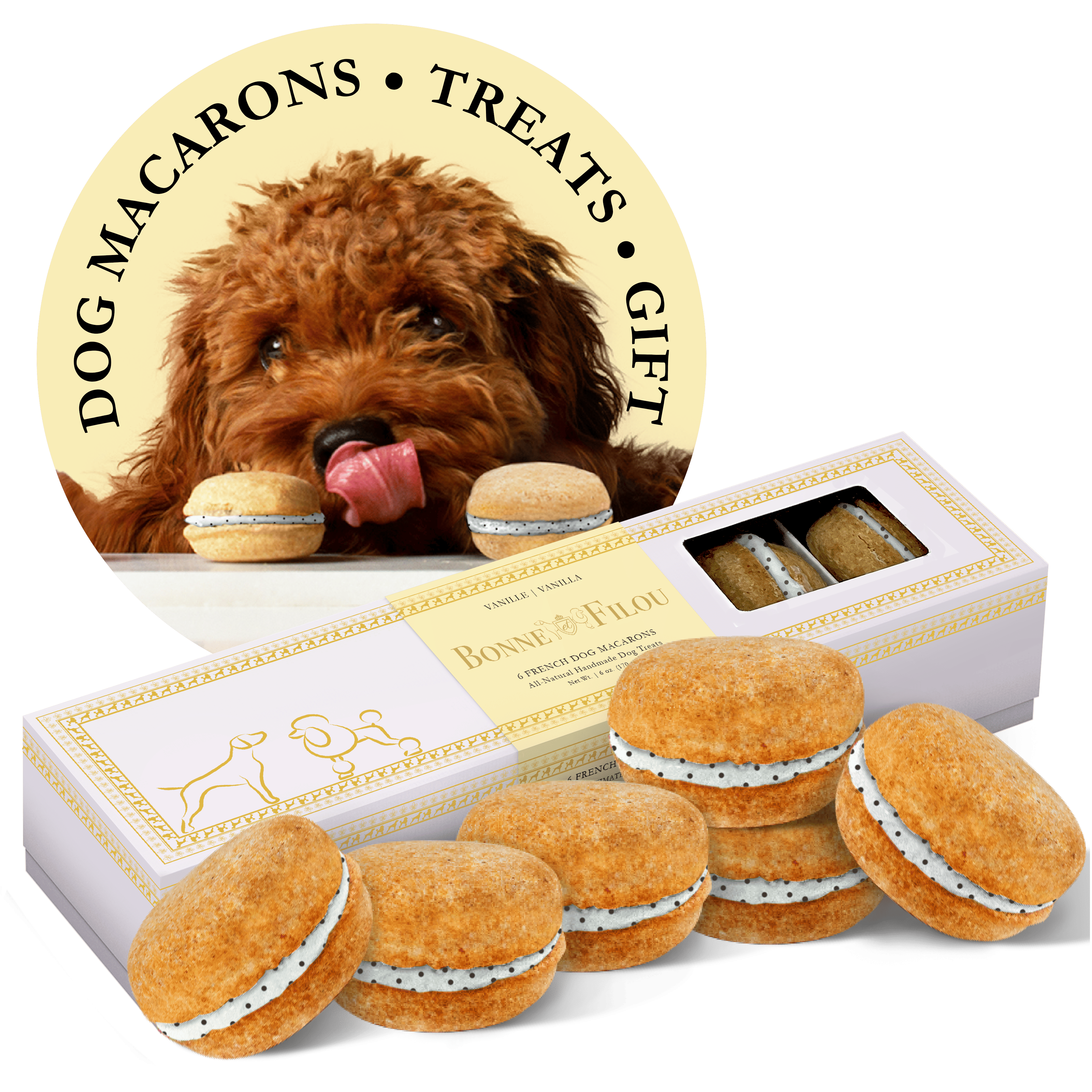 Dog Macarons - Count of 6 (Dog Treats | Dog Gifts)This box of our premium macaron treats features: - Box of 6 dog macarons- Handmade with premium human-grade ingredients in the USA- 100% natural; corn-free; wheat-free ingredients- No artificial coloring or preservatives- Hard treat designed for a long-lasting chew- Shelf life of 18+ months | No need for refrigerationBase Recipe Ingredients: Oat Flour; Honey; Coconut Oil; All-Natural Flavored Yogurt FillingFeeding Instructions:Our treats are hard; designed for a long-lasting chew. For elderly or small dogs; we recommend breaking the treat in smaller pieces (by twisting both sides).