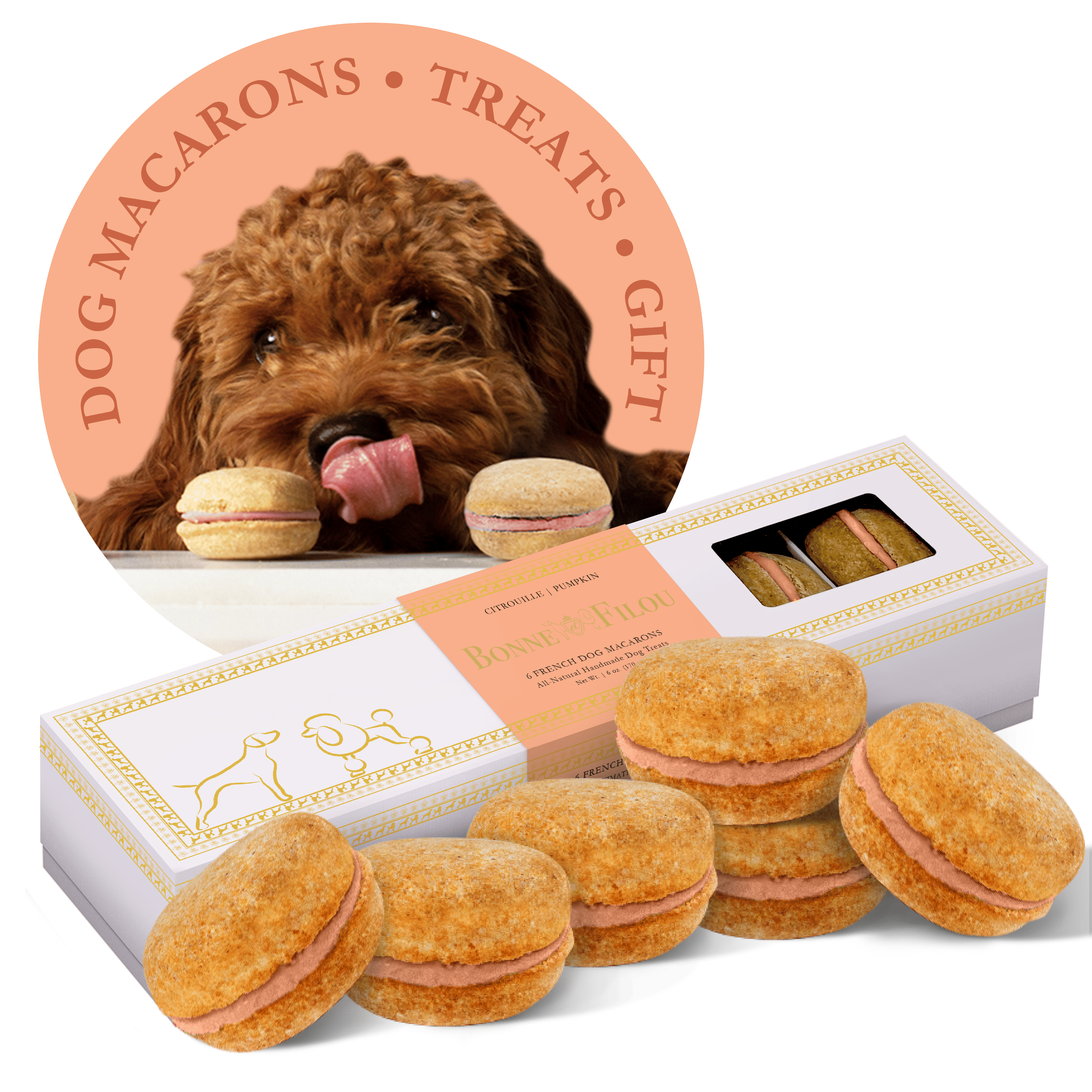 Dog Macarons - Count of 6 (Dog Treats | Dog Gifts)This box of our premium macaron treats features: - Box of 6 dog macarons- Handmade with premium human-grade ingredients in the USA- 100% natural; corn-free; wheat-free ingredients- No artificial coloring or preservatives- Hard treat designed for a long-lasting chew- Shelf life of 18+ months | No need for refrigerationBase Recipe Ingredients: Oat Flour; Honey; Coconut Oil; All-Natural Flavored Yogurt FillingFeeding Instructions:Our treats are hard; designed for a long-lasting chew. For elderly or small dogs; we recommend breaking the treat in smaller pieces (by twisting both sides).