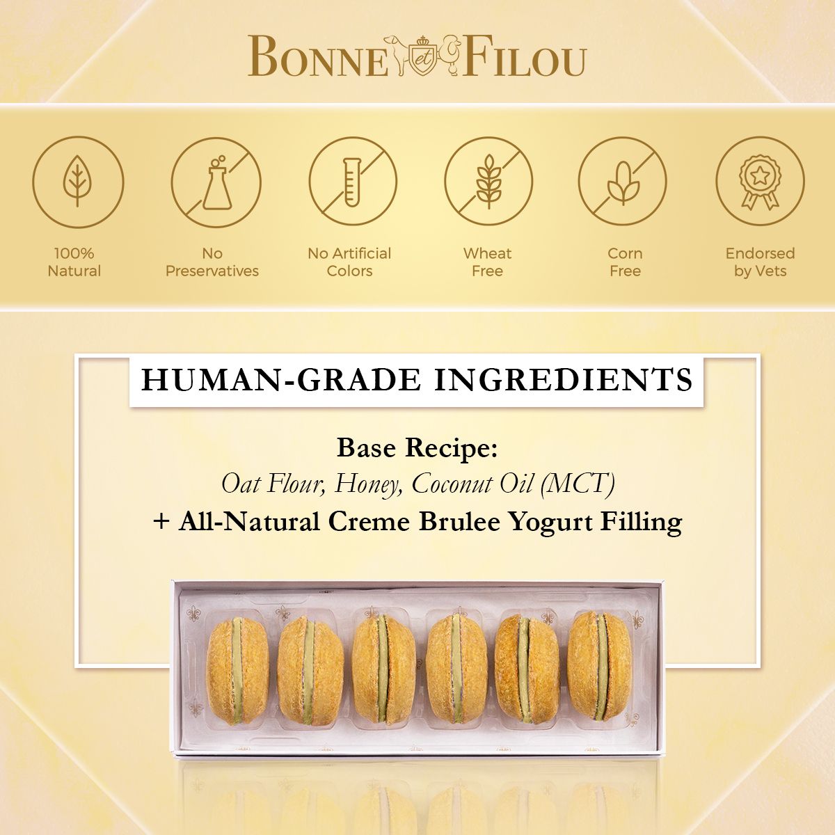 Dog Macarons - Count of 6 (Dog Treats | Dog Gifts)This box of our premium macaron treats features: - Box of 6 dog macarons- Handmade with premium human-grade ingredients in the USA- 100% natural; corn-free; wheat-free ingredients- No artificial coloring or preservatives- Hard treat designed for a long-lasting chew- Shelf life of 18+ months | No need for refrigerationBase Recipe Ingredients: Oat Flour; Honey; Coconut Oil; All-Natural Flavored Yogurt FillingFeeding Instructions:Our treats are hard; designed for a long-lasting chew. For elderly or small dogs; we recommend breaking the treat in smaller pieces (by twisting both sides).