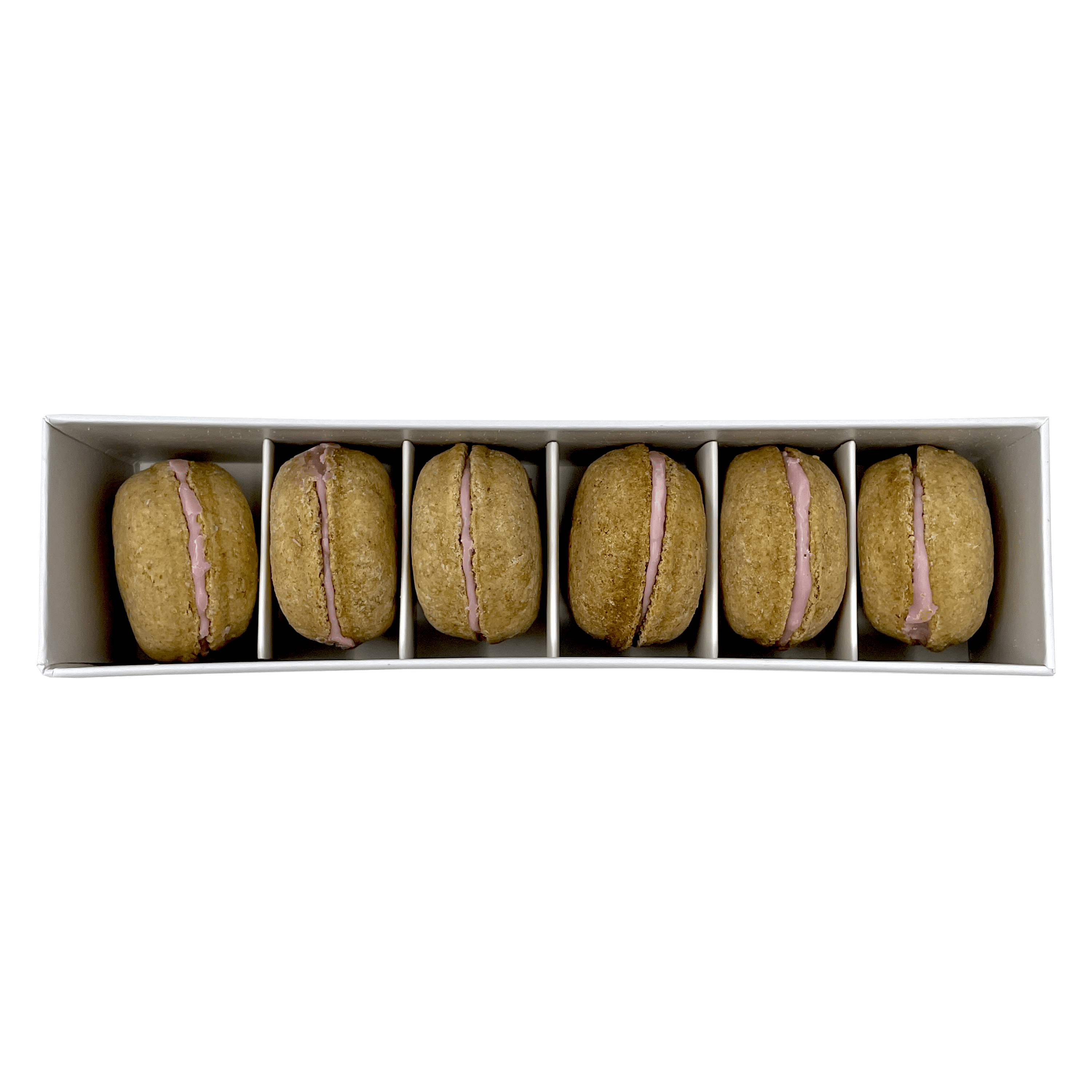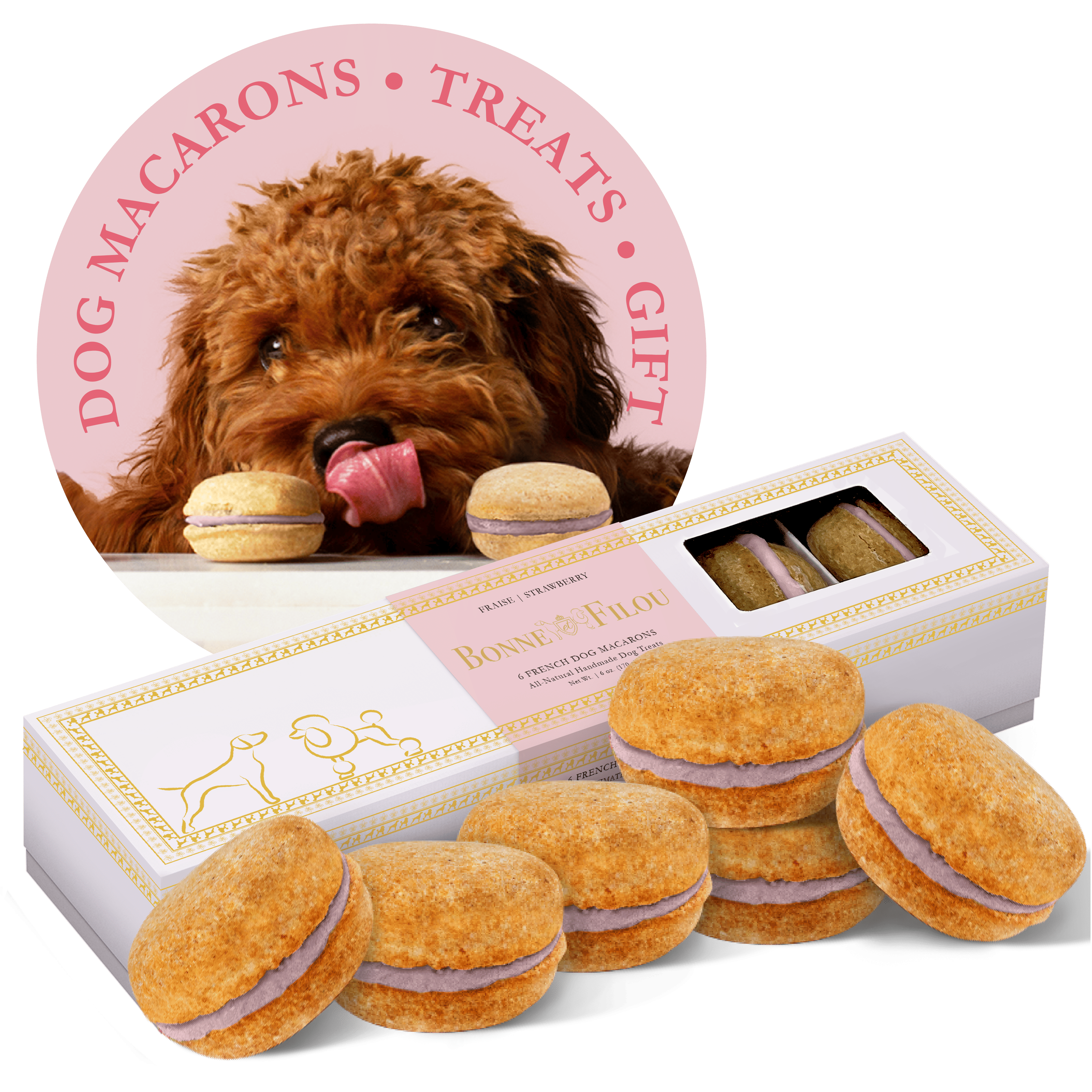 Dog Macarons - Count of 6 (Dog Treats | Dog Gifts)This box of our premium macaron treats features: - Box of 6 dog macarons- Handmade with premium human-grade ingredients in the USA- 100% natural; corn-free; wheat-free ingredients- No artificial coloring or preservatives- Hard treat designed for a long-lasting chew- Shelf life of 18+ months | No need for refrigerationBase Recipe Ingredients: Oat Flour; Honey; Coconut Oil; All-Natural Flavored Yogurt FillingFeeding Instructions:Our treats are hard; designed for a long-lasting chew. For elderly or small dogs; we recommend breaking the treat in smaller pieces (by twisting both sides).
