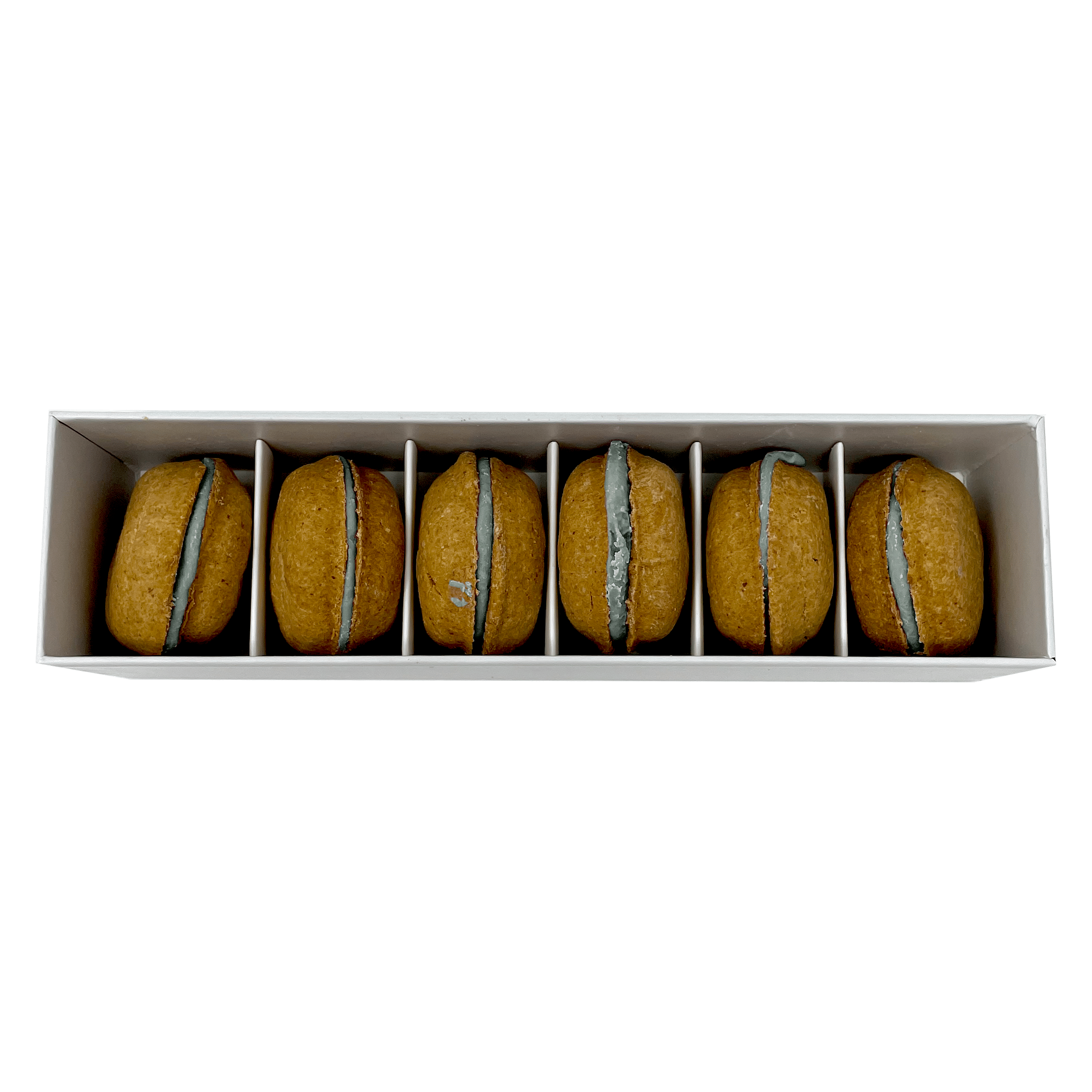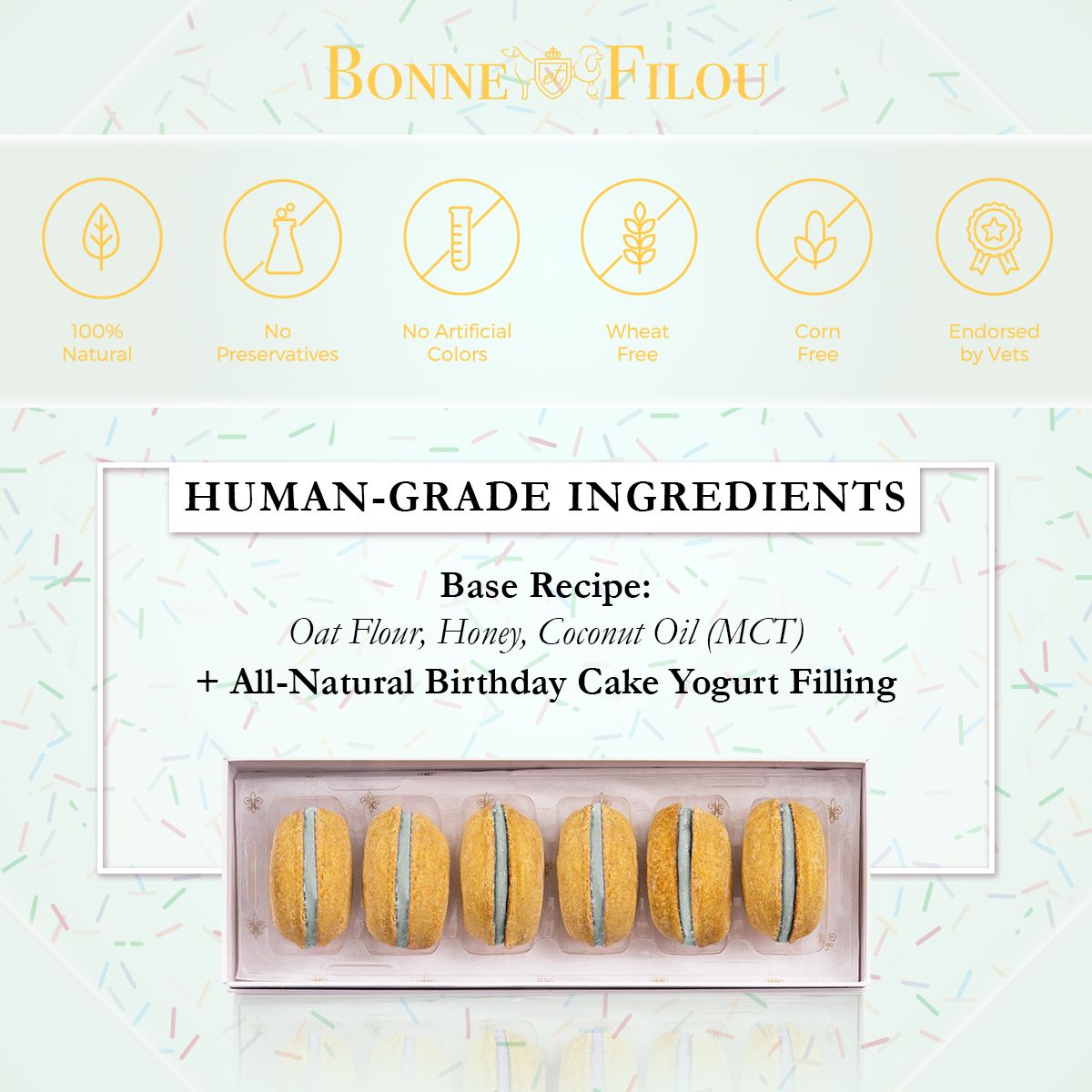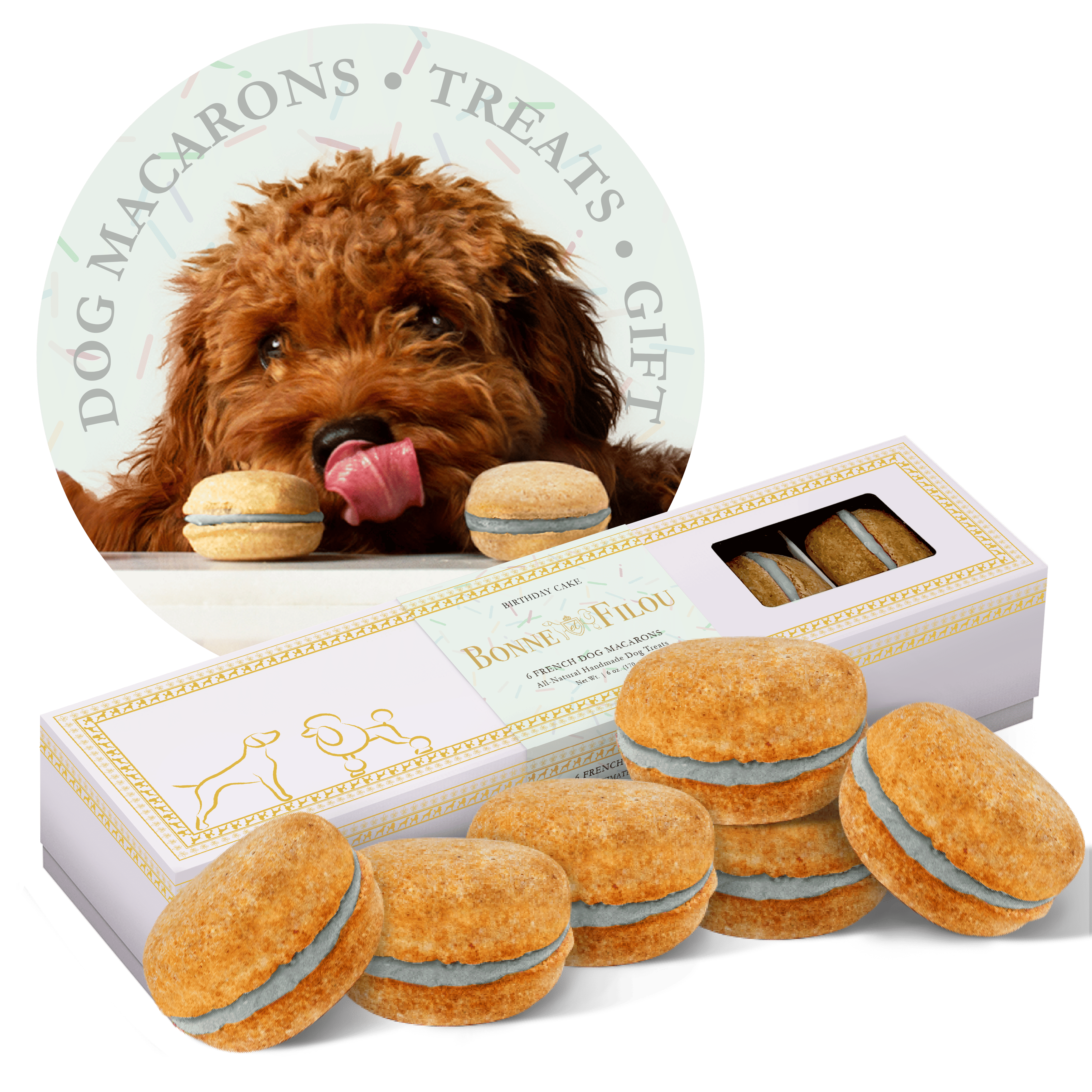 Dog Macarons - Count of 6 (Dog Treats | Dog Gifts)This box of our premium macaron treats features: - Box of 6 dog macarons- Handmade with premium human-grade ingredients in the USA- 100% natural; corn-free; wheat-free ingredients- No artificial coloring or preservatives- Hard treat designed for a long-lasting chew- Shelf life of 18+ months | No need for refrigerationBase Recipe Ingredients: Oat Flour; Honey; Coconut Oil; All-Natural Flavored Yogurt FillingFeeding Instructions:Our treats are hard; designed for a long-lasting chew. For elderly or small dogs; we recommend breaking the treat in smaller pieces (by twisting both sides).
