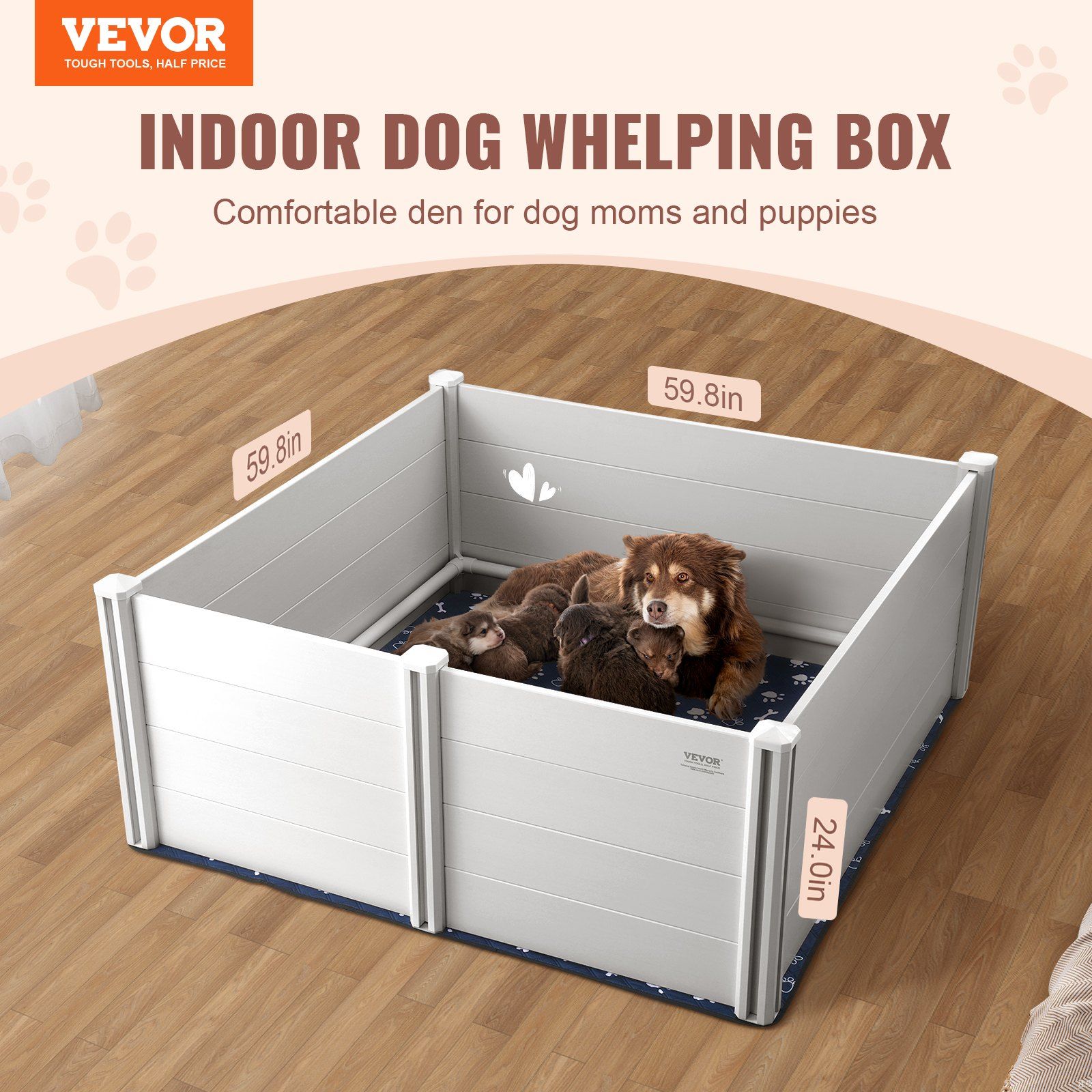 Measuring 59.8 x 59.8 x 24.0 inches, this dog whelping box provides a comfortable shelter and play area for both the mother dog and her puppies. It provides your pets with a dream home and gives owners peace of mind while away.