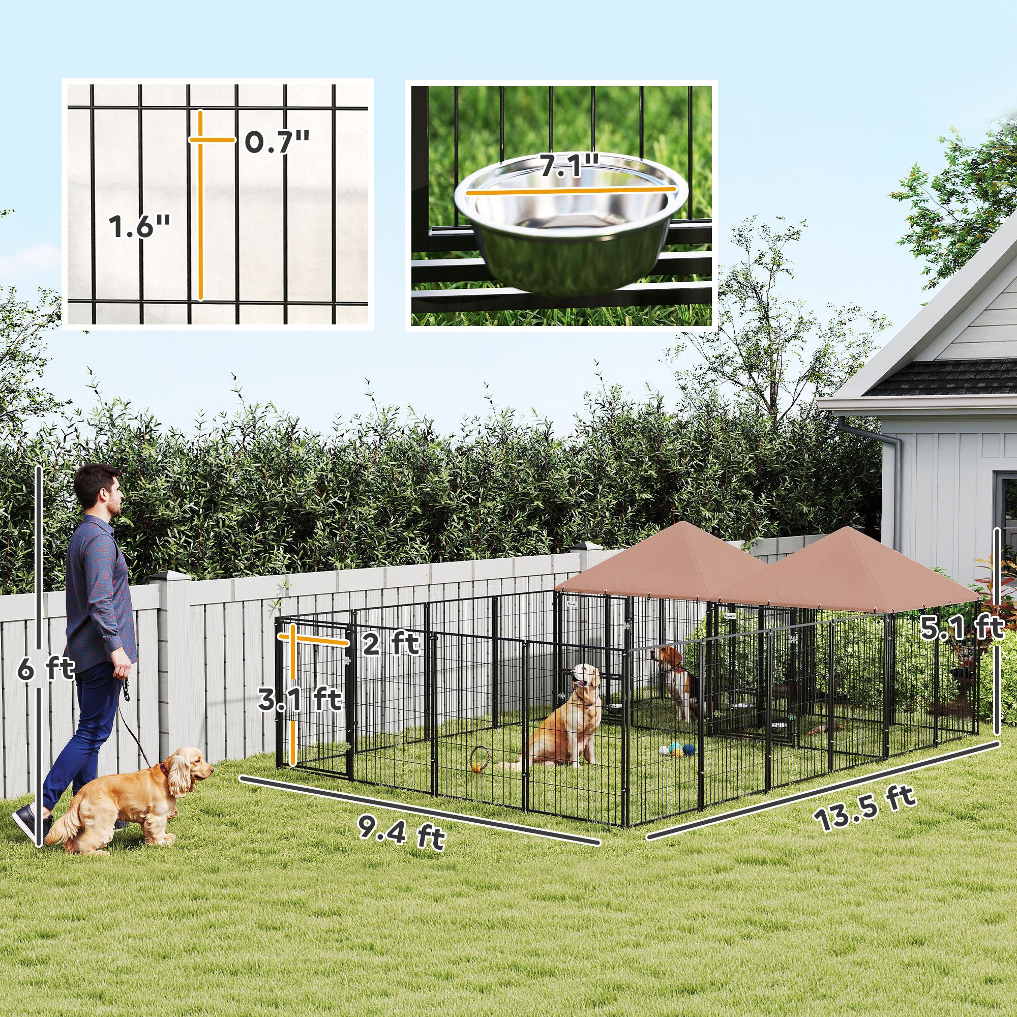 5.- Pet & Owner Friendly: Featuring a tall enclosure and wide-access door, this outdoor dog run prevents pets from jumping out, making entry and exit easy for owners. No more squeezing through tight spaces - just hassle-free access every time