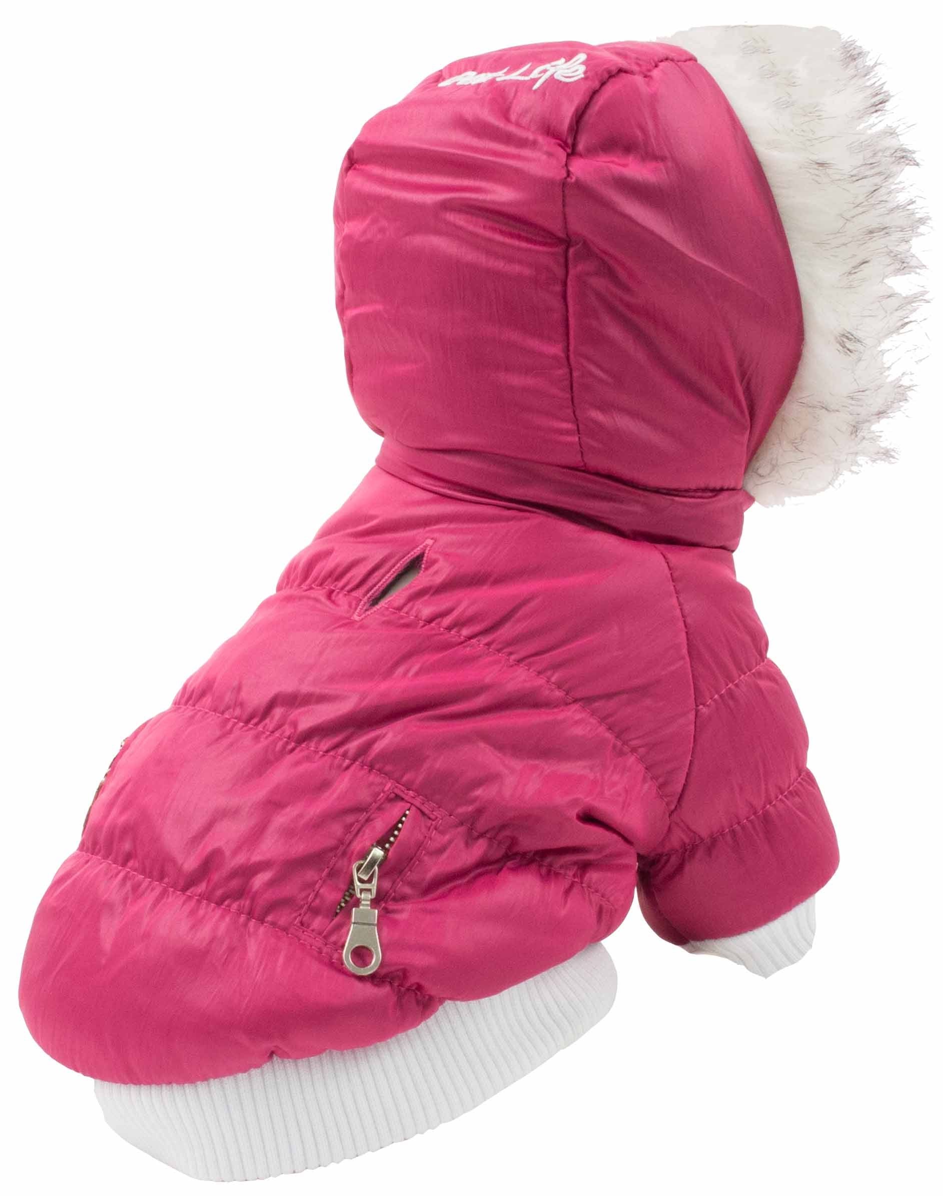 The Pet Life Metallic Parka Dog Coat contains Thinsulate thermal heat retention technology as an inner shell specially inserted between the fabric. This pet coat features matching tone-on-tone inner fleece fabrics, a faux fur removable zip-off hood, a leash slit, and belly-velcro closures for easier on and off access. This coat will keep your pet warmer during those harsher cold weather condition. Available in multiple sizes and colors.