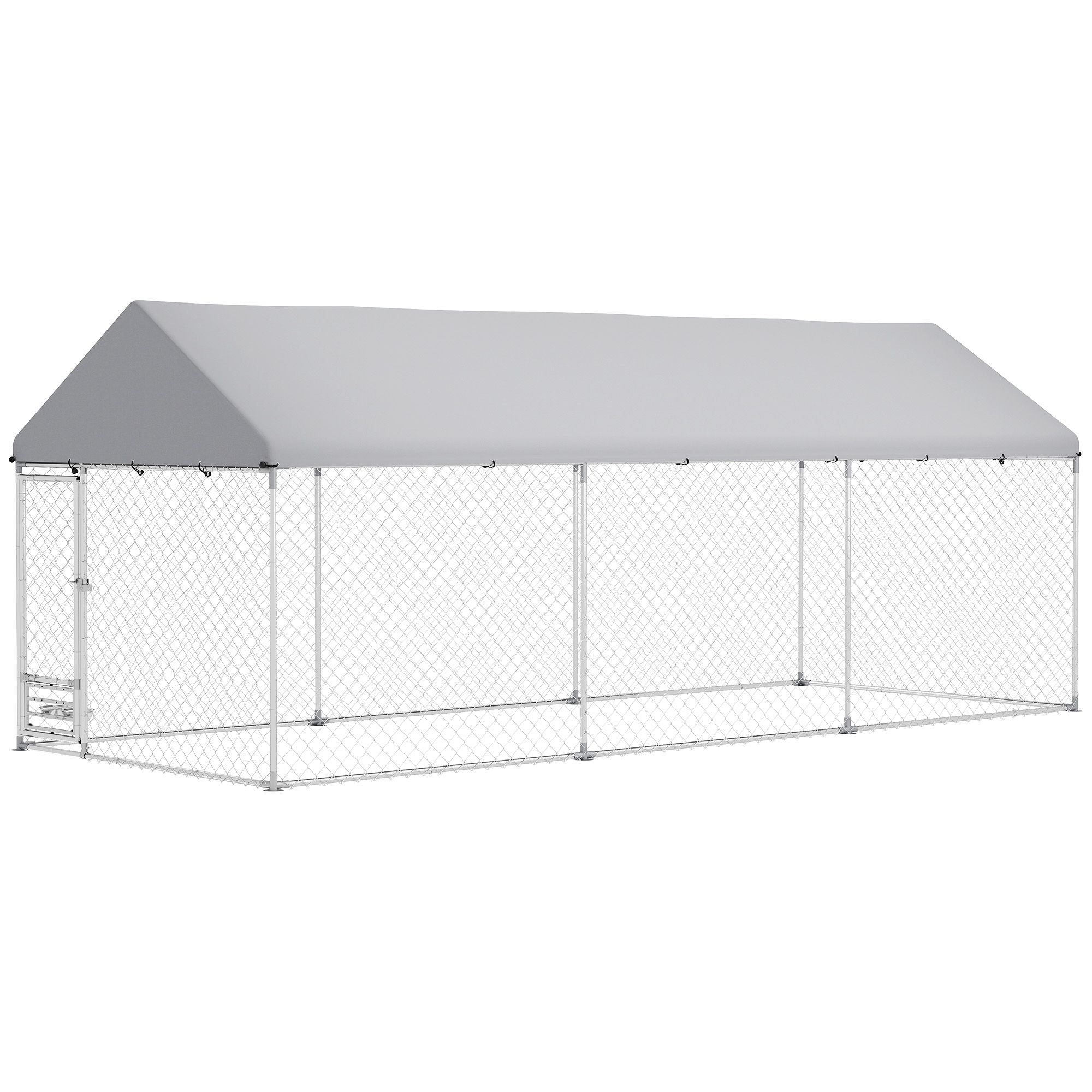 Unleash the joy of spacious living for your pup with the PawHut outdoor dog kennel with roof. Offering a generous 149 sq. ft of play and relaxation area, this outdoor dog run ensures your large dog stays safe with its galvanized steel structure and secure latch. The waterproof, UV-resistant 420D Oxford fabric roof prevents water pooling. Give your pet friends a fun while keeping safety outdoors!