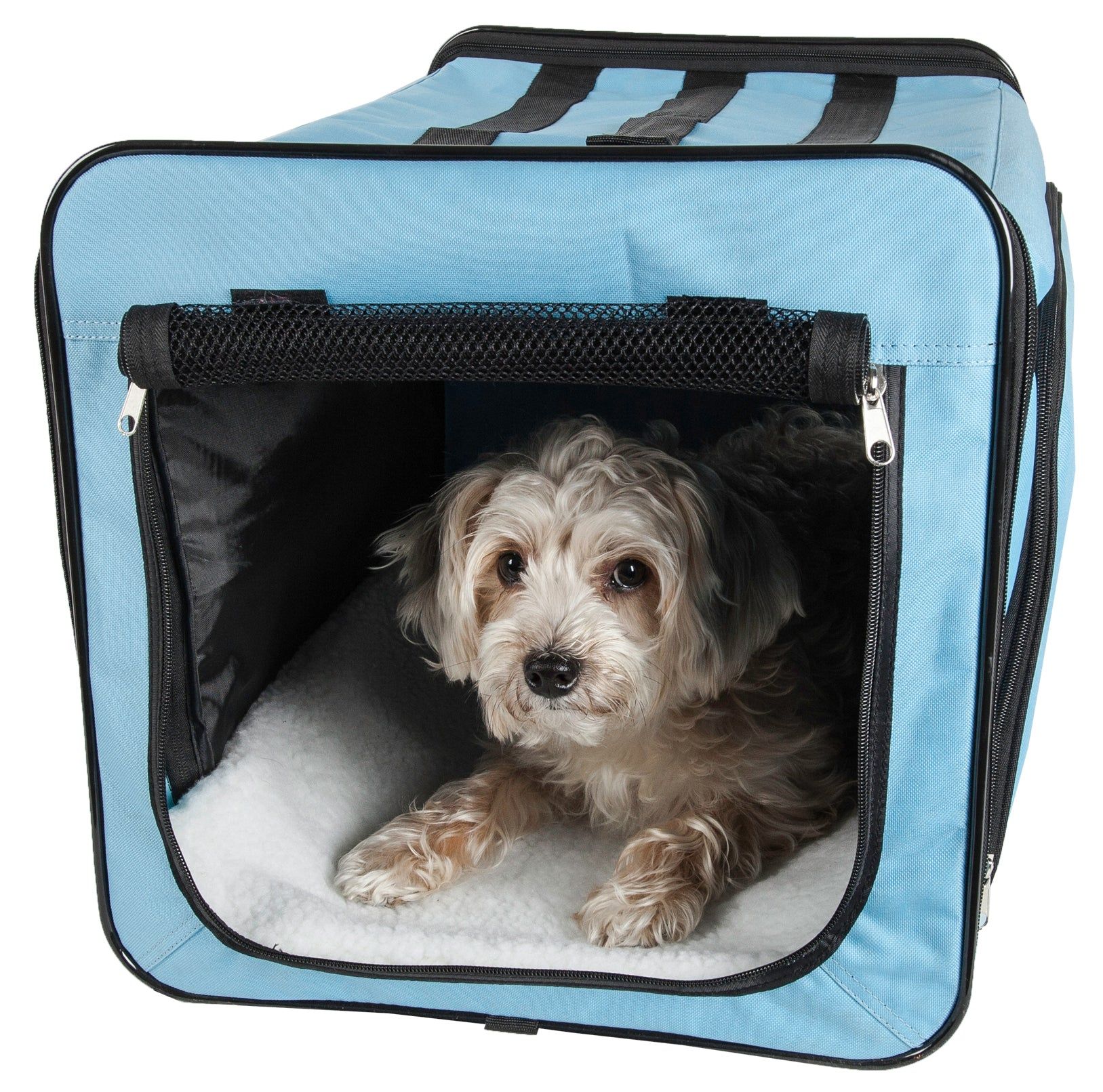 The Pet Life Capacious Expandable wire folding lightweight collapsible crate is composed of heavy-duty Ballistic Nylon and Mesh with bendable yet sturdy built-in flexible extenders that Velcro into place and hold up the 2 outer mesh expandable sides. Fully expands on both sides and collapses and folds. Perfect for multiple pets. Lightweight and great for traveling and indoor or outdoor usages. Features a spacious frontal breathable mesh entrance that rolls up and Velcro's into place, great for added sunlight visibility and exposure when opened with a back mesh window. Features dual reinforced stitching for added durability. Comes with an included reversible plush inner cushion that extends to cover the full surface area. Available in Multiple Colors and Sizes.