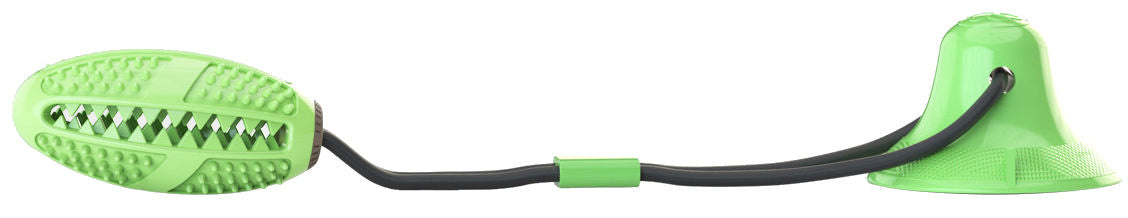 Pet Life ® 'Grip N' Play' Treat Dispensing Football Shaped Suction Cup Dog Toy is designed to suction and grip to any and all hard surfaces in a matter of seconds. Features Dual-Rope strings that provide high-range tension and pull-resistancy that is connected to a Rubberized Football-Shaped Toy containing numerous crevices for placement of Treats and Dry Dog Food for a fun and engaging interactive experience. The Football Toy further features numerous ridges all around designed to massage gums and clean teeth by removing Plaque and Tartar. The Grip N' Play makes a fantastic self tugging toy that helps build muscle strength along the neck and shoulder areas. Features a large Suction cup on the other end with a pinch-to-release flap for convenient removal off hard surfaces. Available in Multiple Colors.